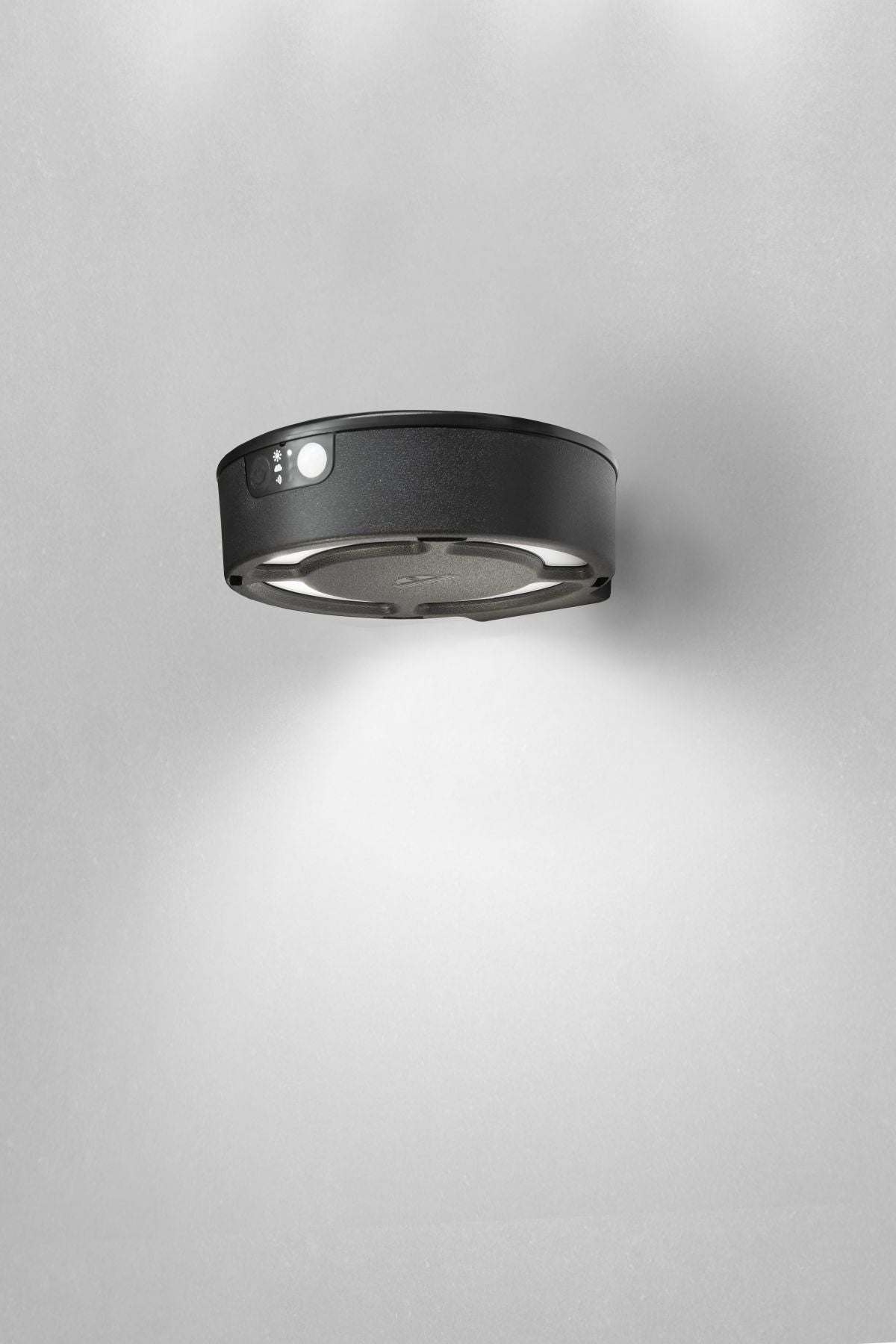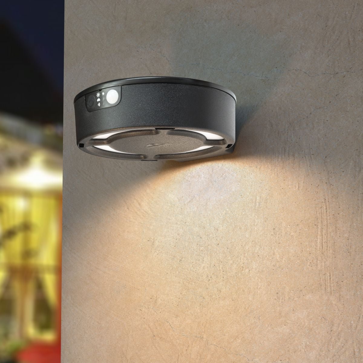 TUV-CB certified SOLAR wall lamp with motion sensor and replaceable battery. Made of shockproof resin material, UV-rays stabilized, rust and corrosion-free. Solar module provided with switch to select the desired Kelvin temperature (3000K – 4000K – 6500K) and working mode (Summer-Winter-Sensor). Insulation class III, protection