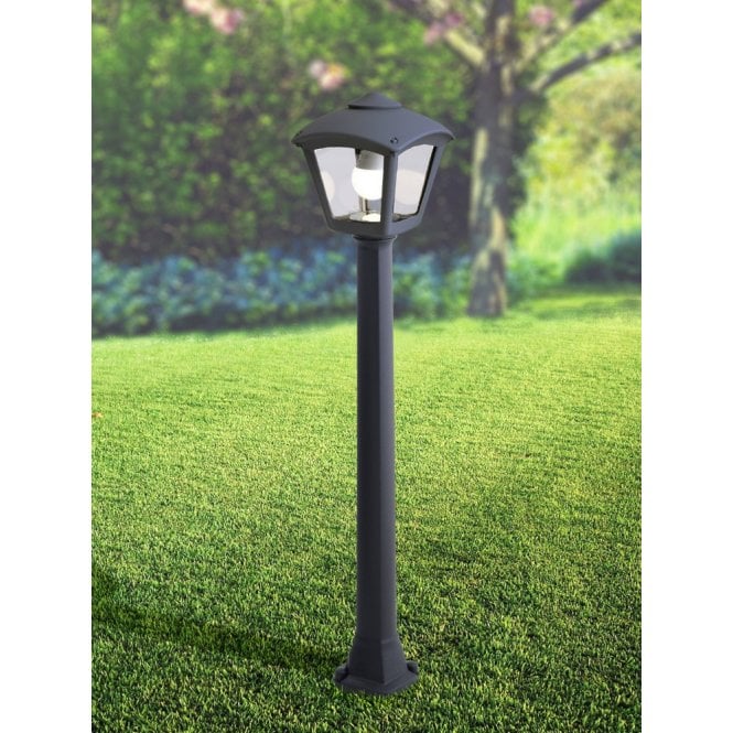 E27 square lantern and pole in a modern style, made of shockproof resin material, UV-rays stabilized, rust and corrosion-free. Supplied with a 6W TÜV-CB certified, long-life and efficient lamp suitable for outdoor use. Insulation class II, protection rating IP55.