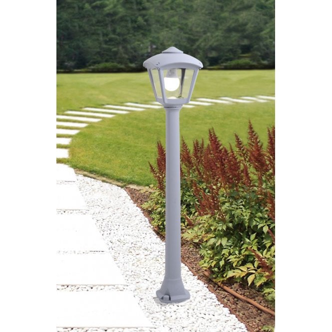 E27 square lantern and pole in a modern style, made of shockproof resin material, UV-rays stabilized, rust and corrosion-free. Supplied with a 6W TÜV-CB certified, long-life and efficient lamp suitable for outdoor use. Insulation class II, protection rating IP55.