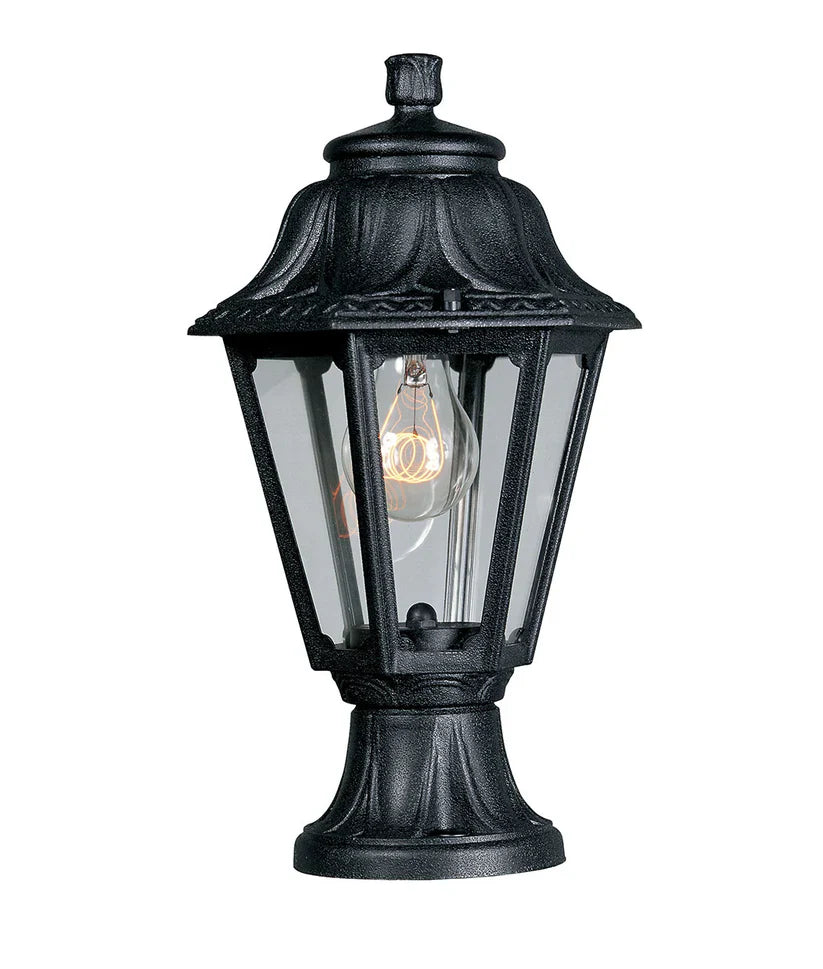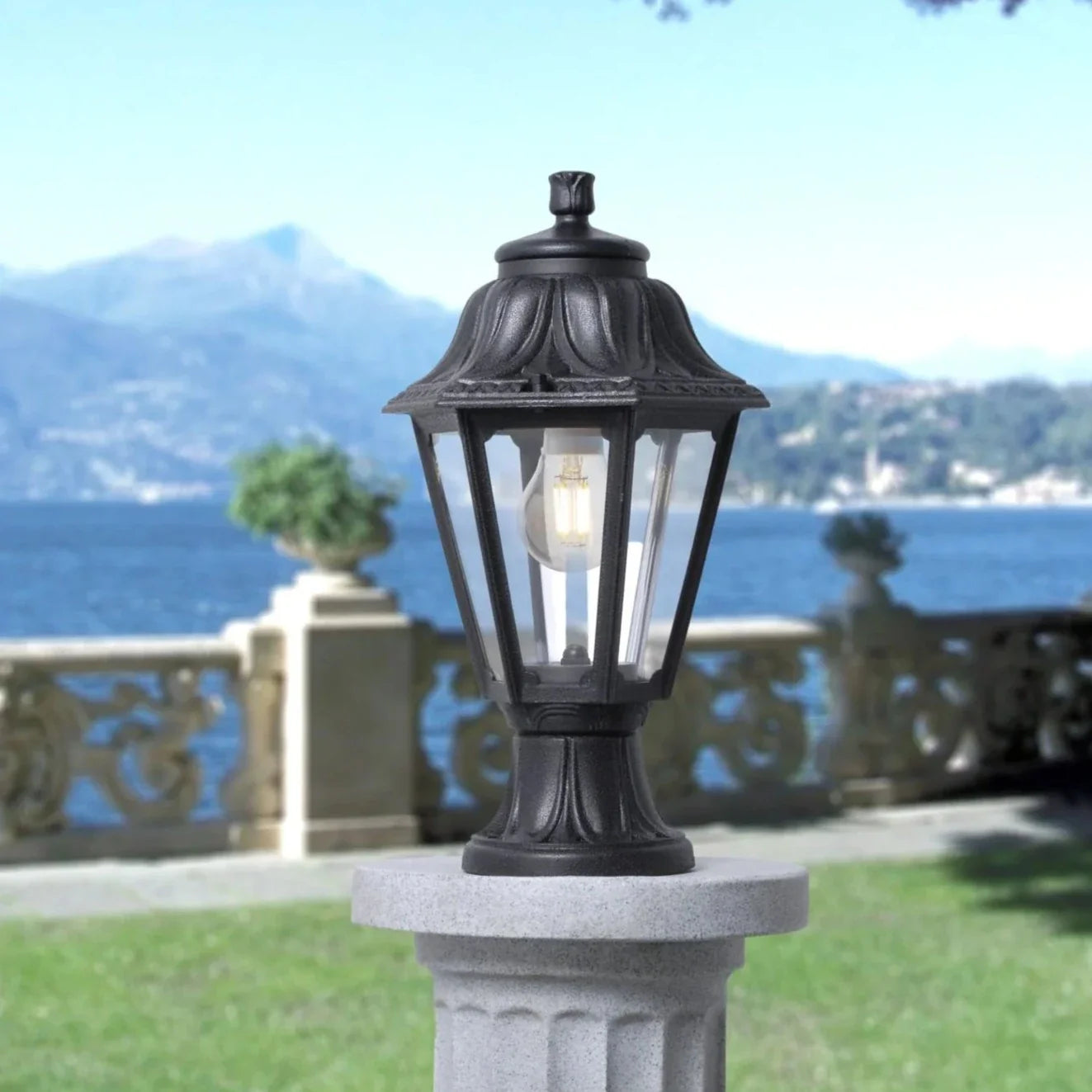 This E27 hexagonal post/pillar top lantern in classic style is made of shockproof resin material, UV-rays stabilized, rust and corrosion-free. Insulation class II, protection rating IP55.