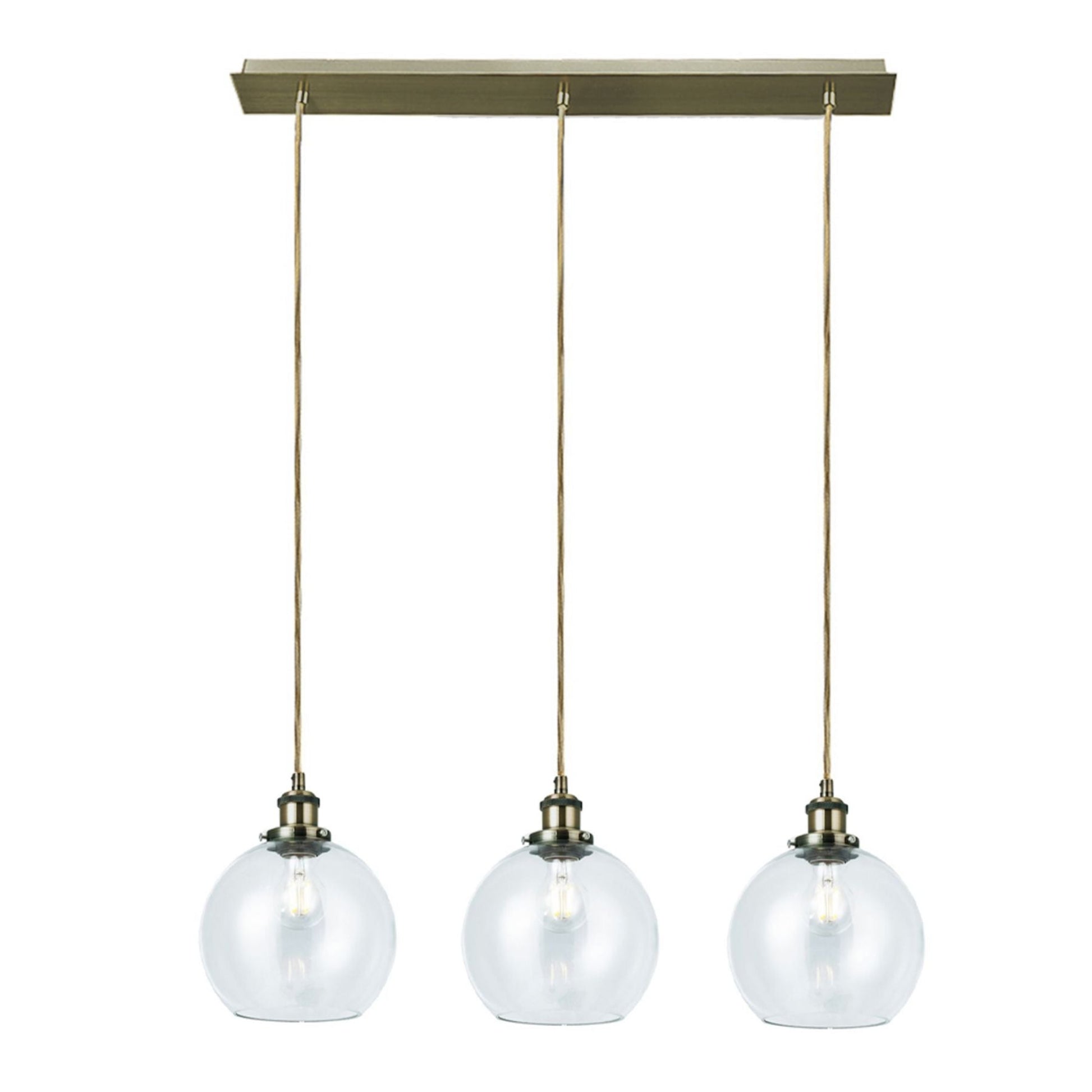 Simplistic spherical shaped clear glass shades with exposed lamp hanging from antique brass bar, ideal for hanging over a kitchen island to create the perfect setting. The Bar Pendant has a decorative matching antique brass braided flex and exposed screws to give an industrial, vintage styling. (Available for viewing in our showroom).